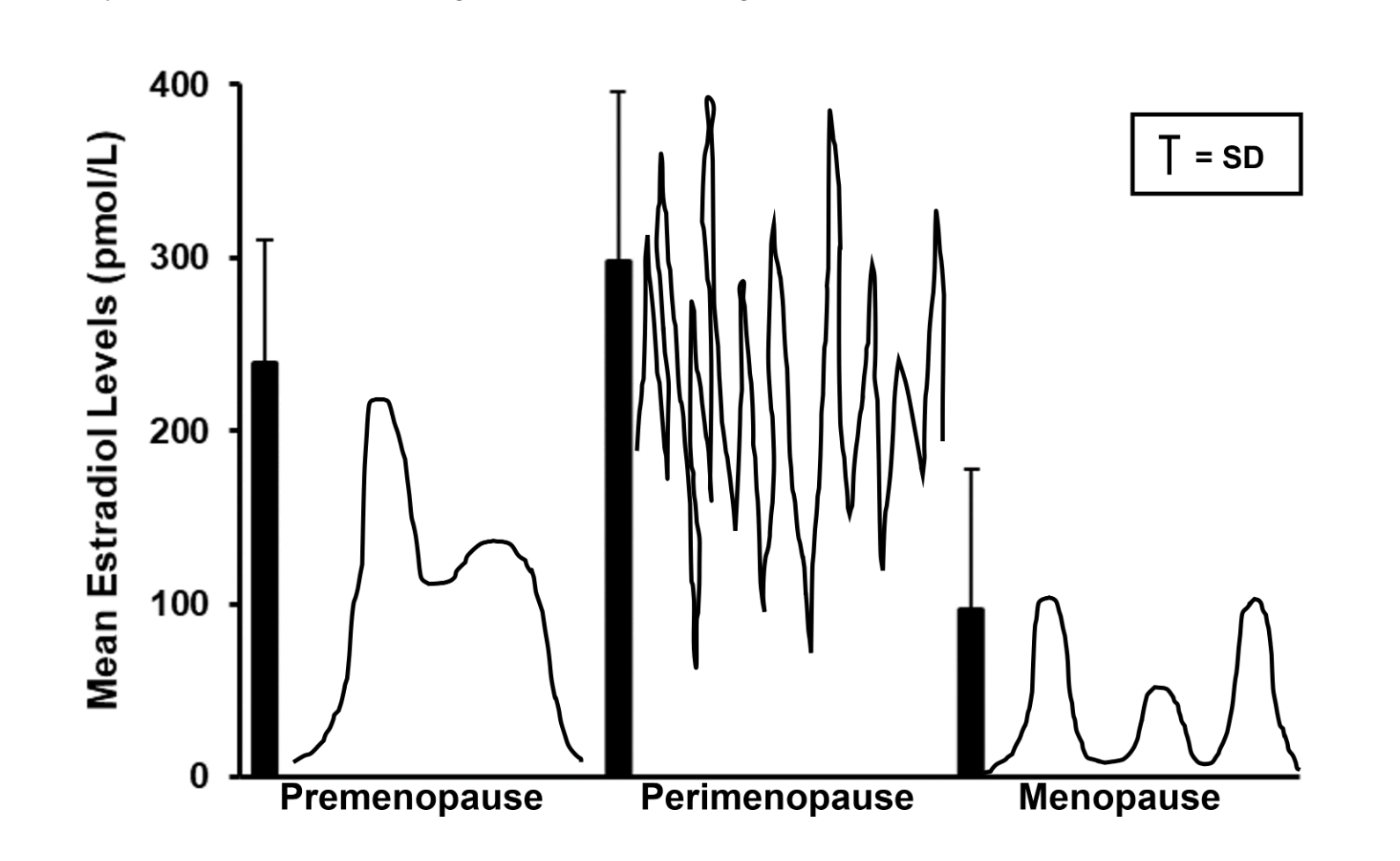 Below is one of my favourite charts detailing the changes in estradiol levels premenopause to perimenopause to menopause. It is from Dr. Jerrilyn Prior’s CEMCOR website and I highly recommend people to take a look at the hormone explanations on the CEMCOR UBC page.